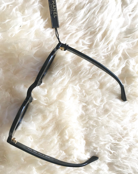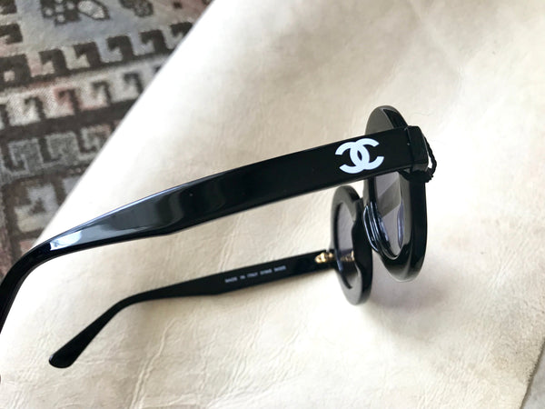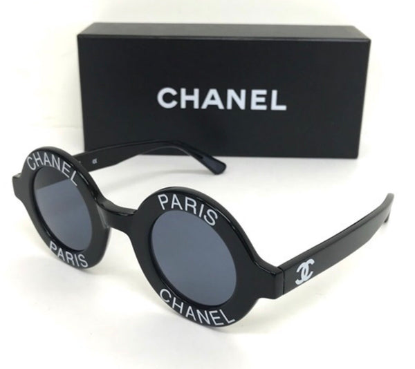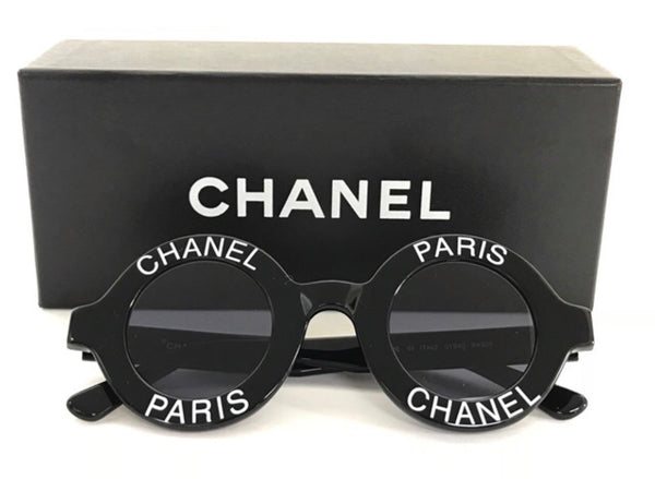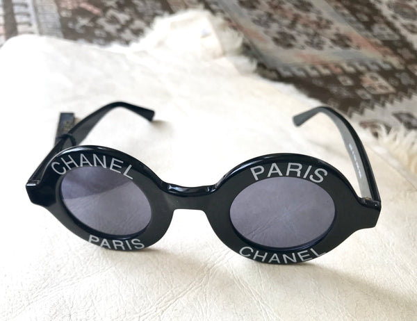 MINT. 1990s. Vintage CHANEL black round frame sunglasses with white CHANEL PARIS print on it. Must have.