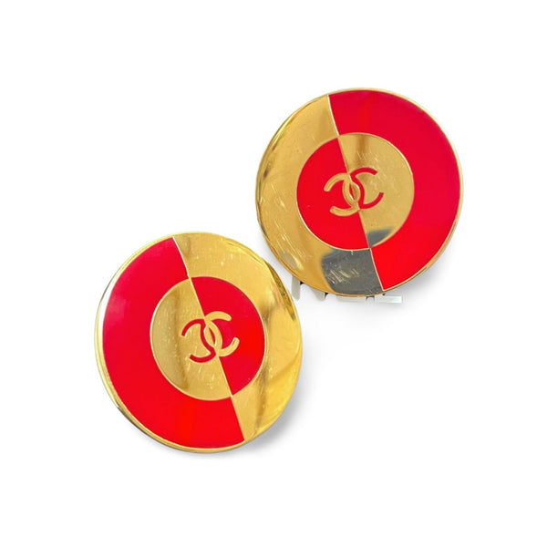 Introducing a 90s vintage CHANEL nice, heavy, and large round earrings in mod design with red, gold, and CC mark geometric design.