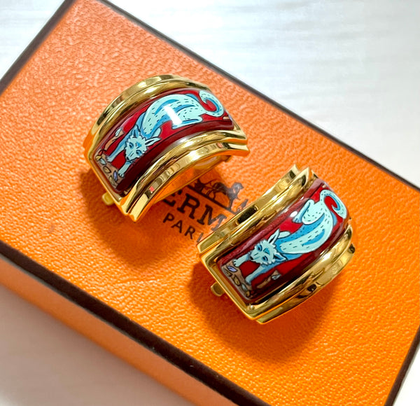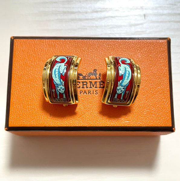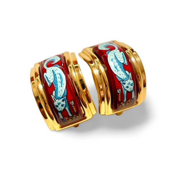 Vintage Hermes cloisonne enamel golden earrings with blue fox on red design. Classic Hermes jewelry.